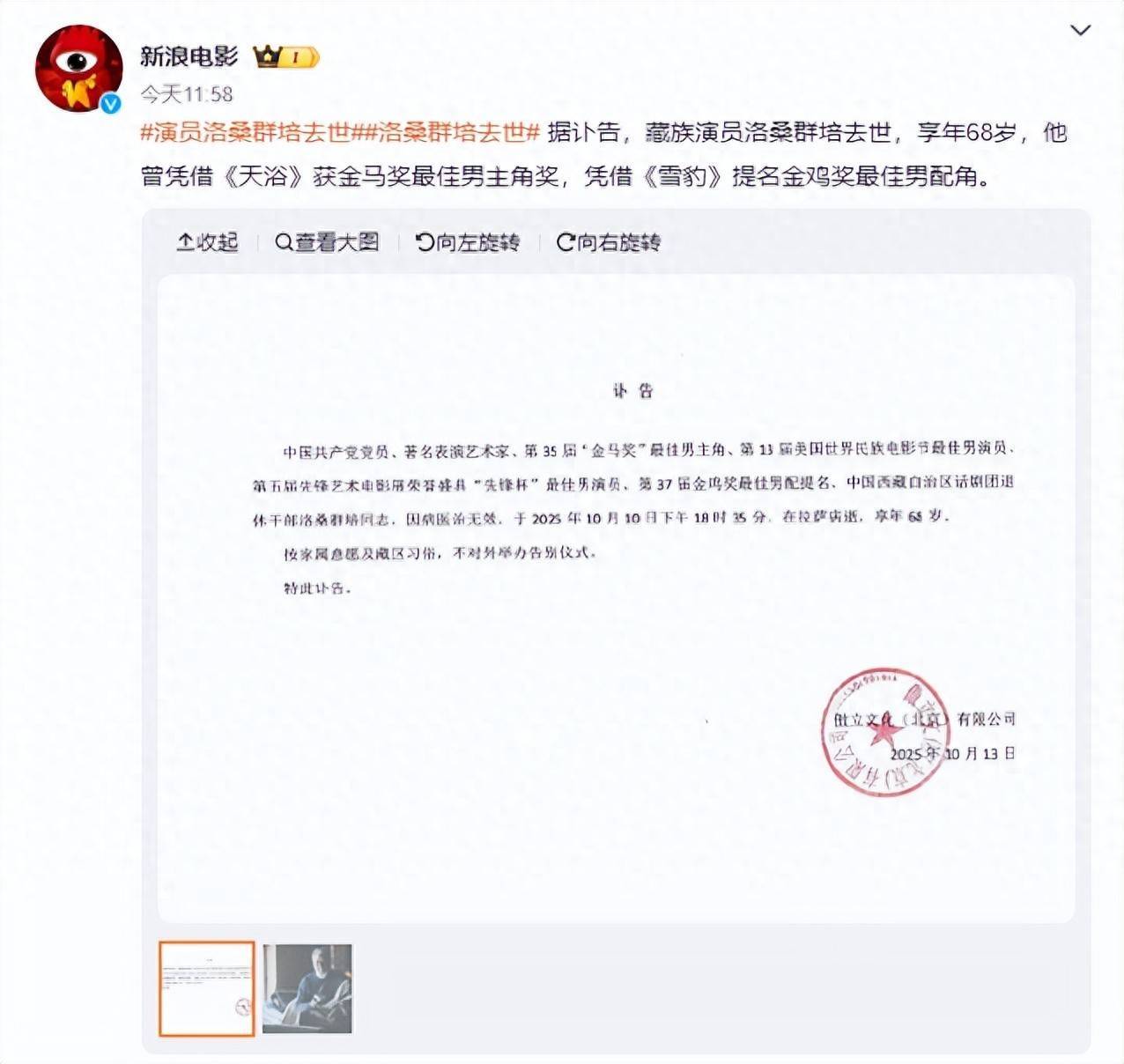 2025分,西藏拉萨的暮色中,一颗璀璨的演艺之星悄然陨落。著名藏族演员洛桑群培因病医治无效逝世,享岁。消息经傲立文化公司及环球网等权威媒体确认后,引发演艺界与观众集体悼念。这位从雪域高原走向国际影坛的艺术家,用半个世纪的坚守与突破,在光影世界中镌刻下永恒的藏地印记。